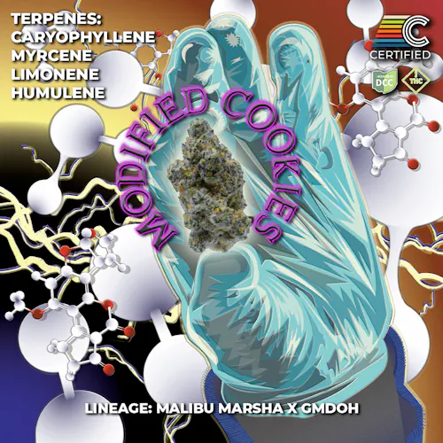 DESCRIPTION: Modified Cookies (Malibu Marsha × GMDOH) is a deeply resinous, indica-leaning hybrid. This cut features dense, chunky buds blanketed in thick trichomes and frosty sugar leaves that range from deep olive to almost silvery green. The heavy coating gives the flower a snowy appearance, punctuated by bright amber pistils curling tightly across the surface. Its rich terpene profile — led by Caryophyllene, Myrcene, and Limonene — lays the foundation for a bold sensory experience, while Humulene, Linalool, and Bisabolol contribute floral spice, subtle calm, and complexity. Robust, potent, and unmistakably funky.